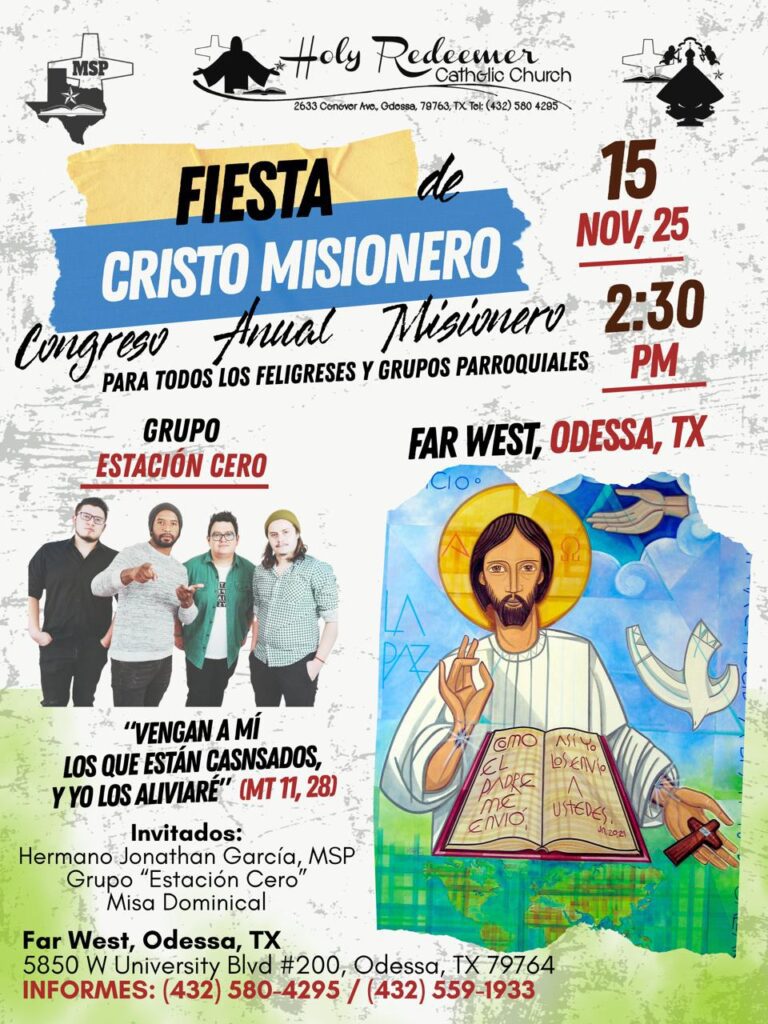 ¡Cristo Misionero ha llegado! ¡Acompáñenos el sábado 15 de noviembre de 2:30 p. m. a 10:00 p. m. para una tarde llena de fe! Podrás disfrutar de la música del grupo colombiano Estación Cero. También habrá charlas espirituales de invitados especiales, comida, actividades, adoración y Santa Misa. Este evento será organizado por los Misioneros Servidores de la Palabra y tendrá lugar en el Far West Event Center. ¡Esperamos verte allí! Encontrarás más información a continuación.