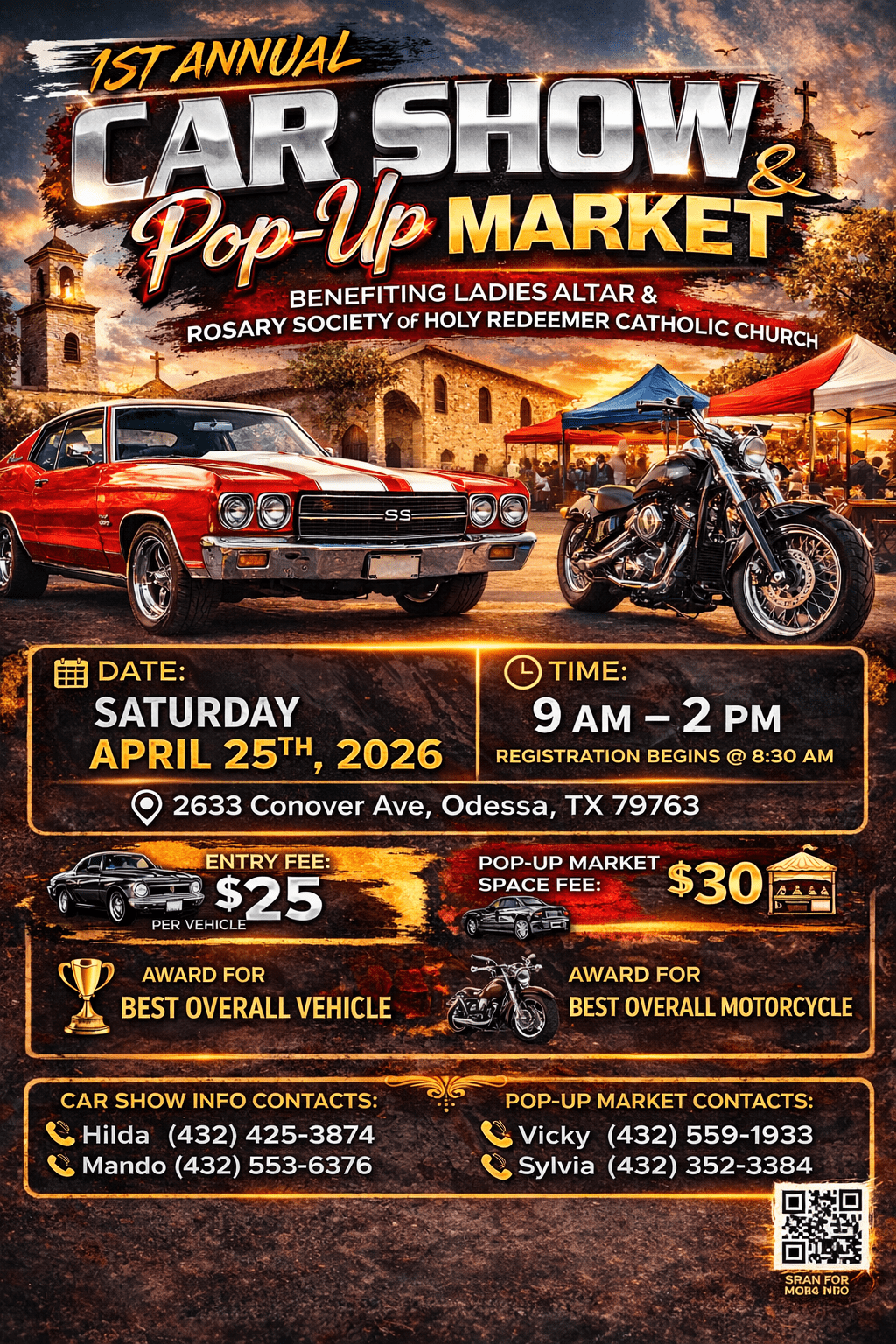 ¡Enciende motores y únete a la emoción en el 1er Car Show & Pop-Up Market anual este sábado 25 de abril de 2026! Este animado evento comunitario se llevará a cabo aquí en Holy Redeemer, de 9:00 a.m. a 2:00 p.m. (con registro comenzando a las 8:30 a.m.) y ofrece algo para todos. Admira una impresionante exhibición de autos clásicos y motocicletas espectaculares compitiendo por Mejor Vehículo en General y Mejor Motocicleta en General, mientras recorres un vibrante mercado con vendedores locales. Con una cuota de inscripción de solo $25 por vehículo y espacios para vendedores disponibles por $30, es la oportunidad perfecta para mostrar tu auto o tu negocio. Lo mejor de todo es que el evento apoya a la Sociedad del Altar y el Rosario de la Iglesia Católica Holy Redeemer, así que podrás disfrutar de un gran día mientras contribuyes a una buena causa. ¡Trae a tu familia, invita a tus amigos y no te pierdas este día inolvidable lleno de motores, comunidad y celebración!