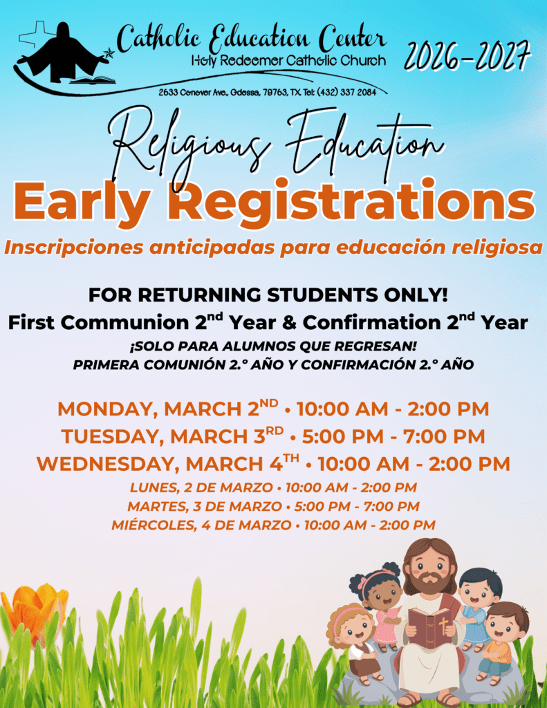 ¡Ya casi es hora de las inscripciones anticipadas para los ESTUDIANTES QUE REGRESAN! Si su hijos están a punto de terminar su primer año de Confirmación y/o Primera Comunión, pueden pasar por la oficina de Educación Religiosa en los horarios que se indican a continuación para inscribirlos en su segundo año.