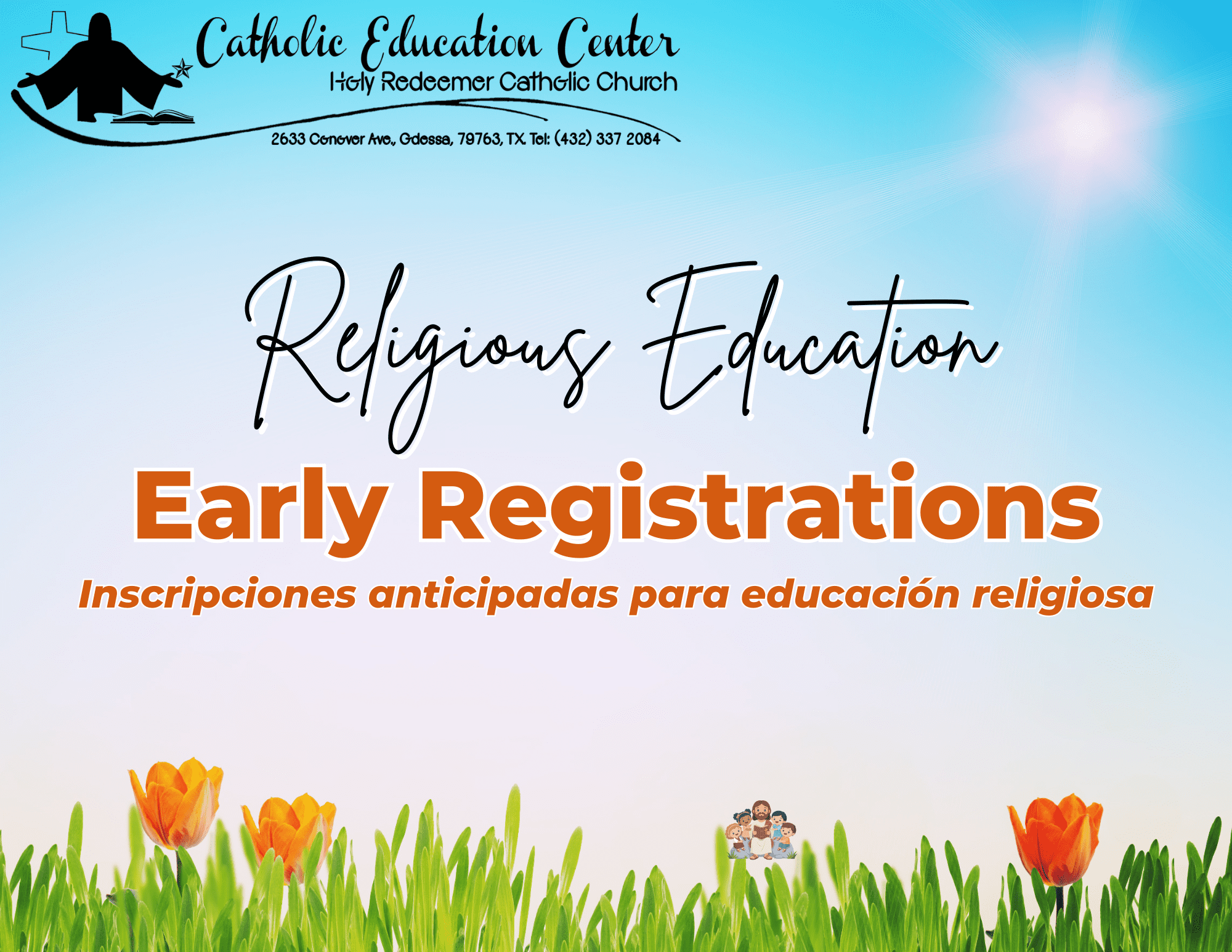 ¡Ya casi es hora de las inscripciones anticipadas para los ESTUDIANTES QUE REGRESAN! Si su hijos están a punto de terminar su primer año de Confirmación y/o Primera Comunión, pueden pasar por la oficina de Educación Religiosa en los horarios que se indican a continuación para inscribirlos en su segundo año.