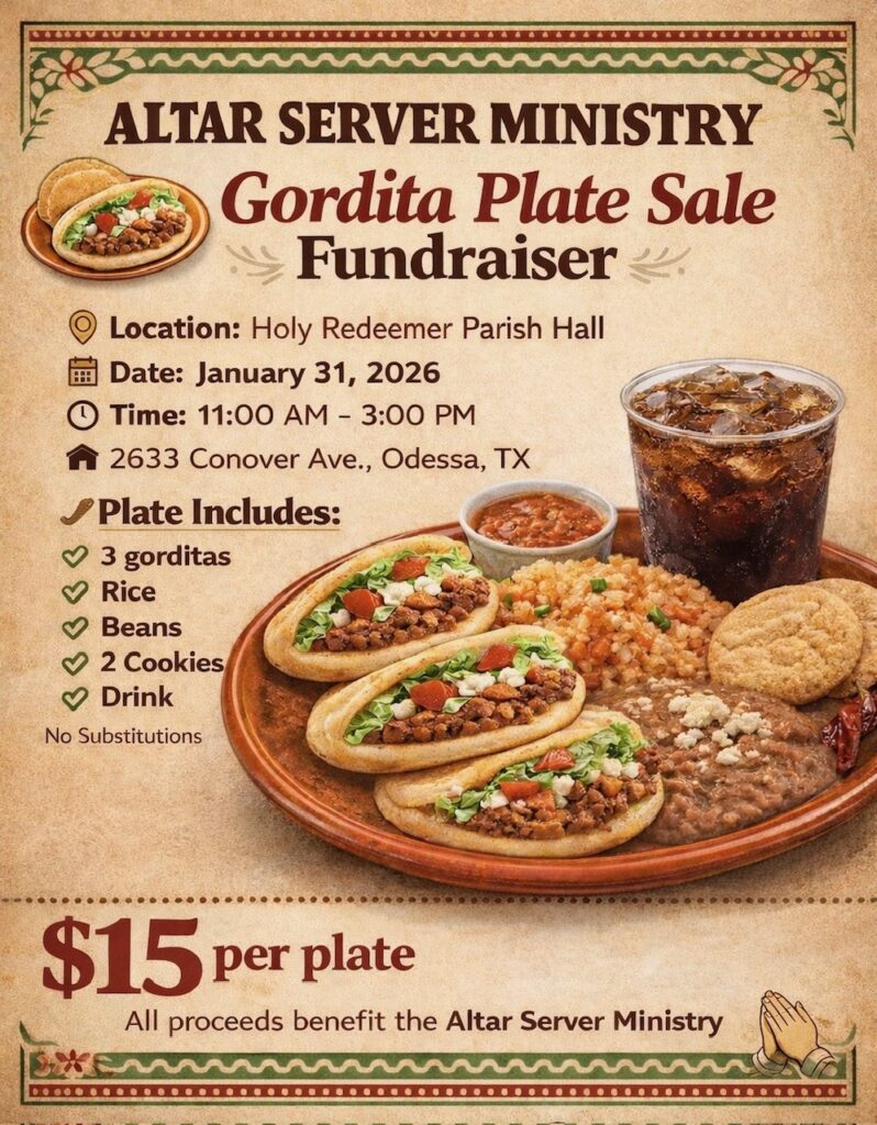 Join us on January 31st from 11:00 AM to 3:00 PM for The Altar Server Ministry Gordita Plate Sale. Each plate includes gorditas, rice, beans, cookies and a drink all for $15.00!
