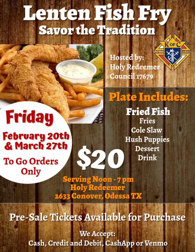 The Knights of Columbus will be having two dates for their Annual Lenten Fish Fry! Join us on February 20th and March 27th of 2026 from 12pm-7pm!