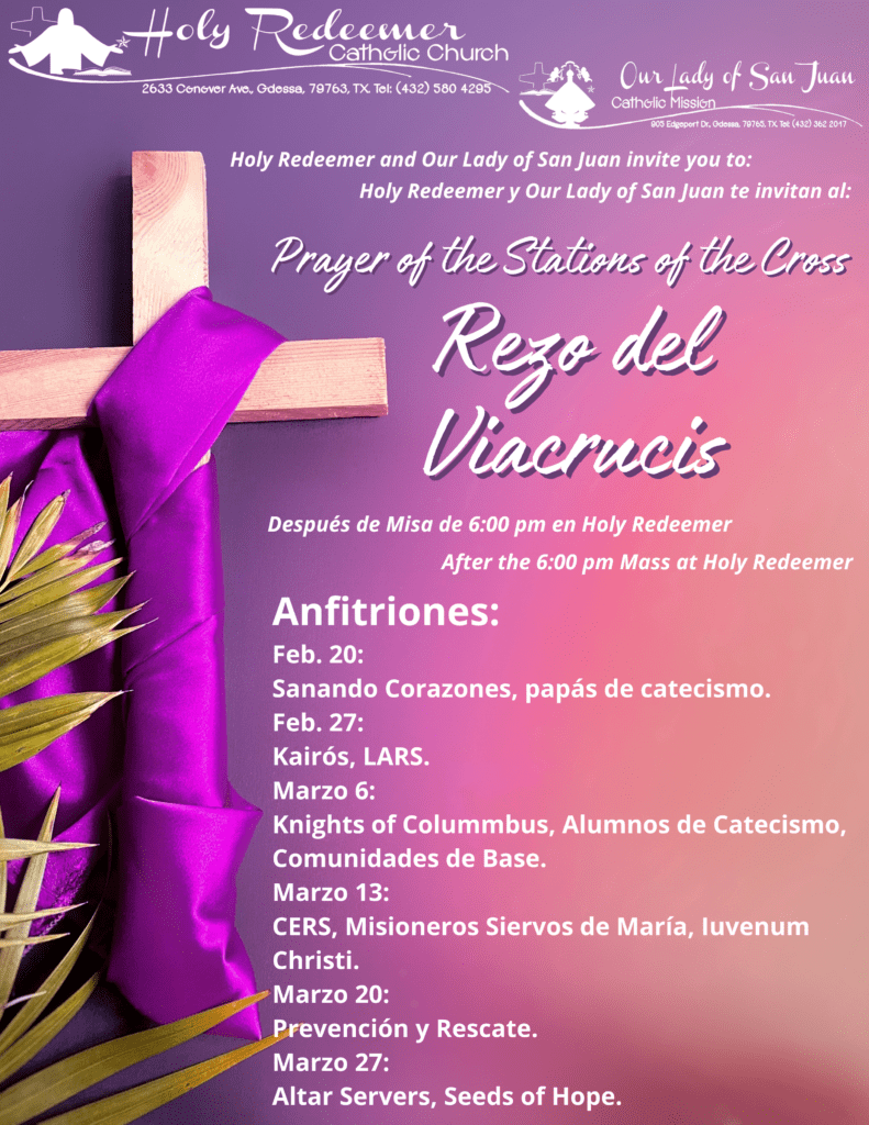 ¡Acompáñanos a rezar el Vía Crucis! Todos los viernes después de la misa de las 6:00 pm la comunidad comenzará en la iglesia. ¡Todos son bienvenidos!