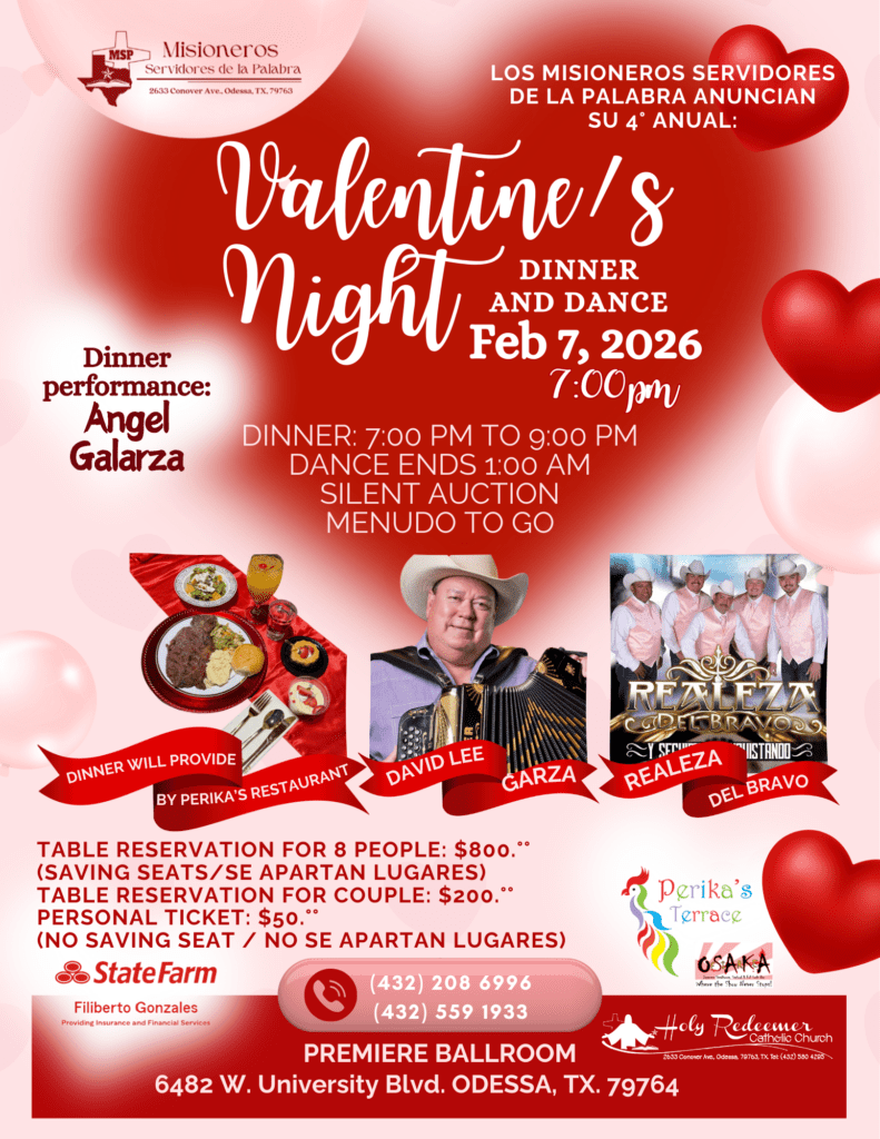 ¡Los Misioneros Servidores de La Palabra organizarán una Noche de San Valentín el 7 de febrero a partir de las 7:00 pm en el Premiere Ballroom! ¡Disfruta de una deliciosa cena y baila toda la noche! Los boletos cuestan $50 cada uno, comuníquese con la oficina parroquial para obtener su boleto o para más información!